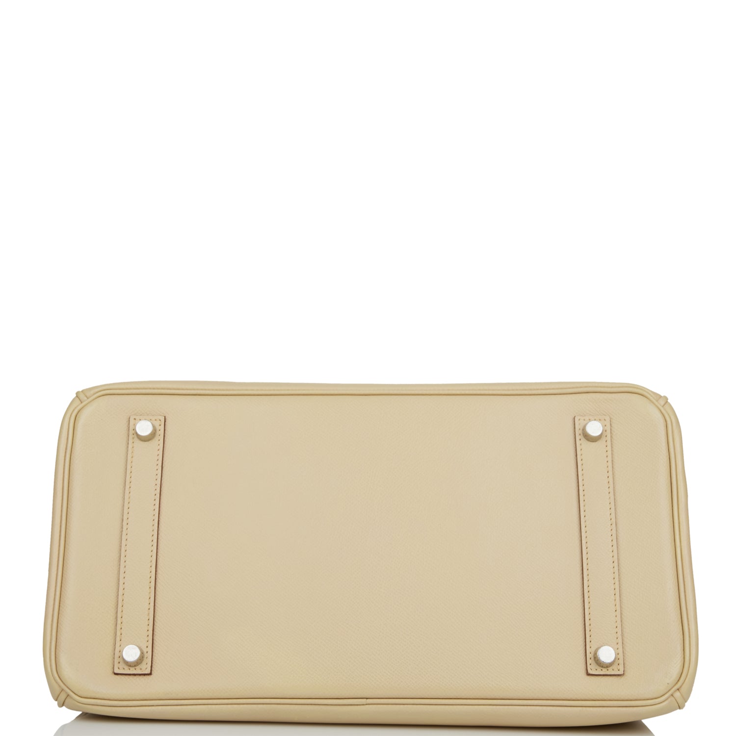 This Birkin is in Parchemin epsom leather with palladium hardware and has tonal stitching, front flap, two straps with center toggle closure, clochette with lock and two keys, and double rolled handles.
