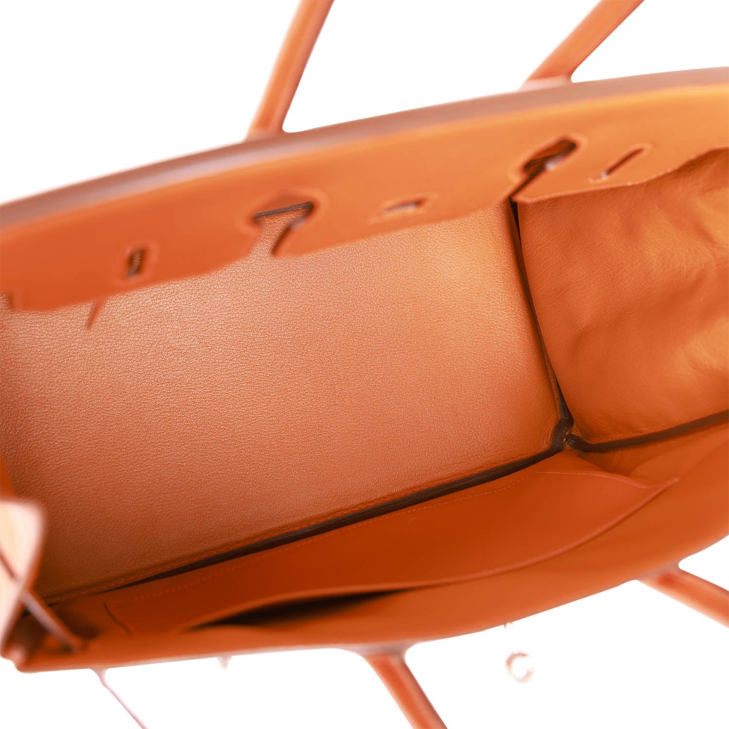 This Birkin is in Potiron chevre leather with palladium hardware and has tonal stitching, front flap, two straps with center toggle closure, clochette with lock and two keys, and double rolled handles.