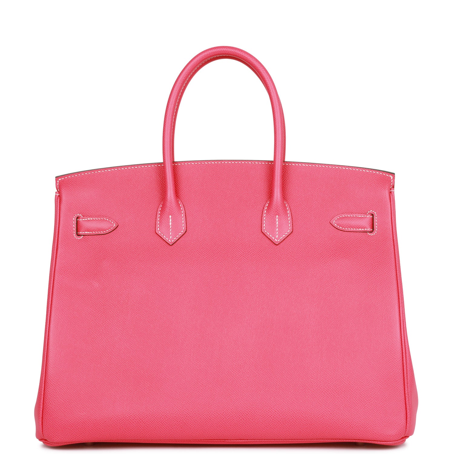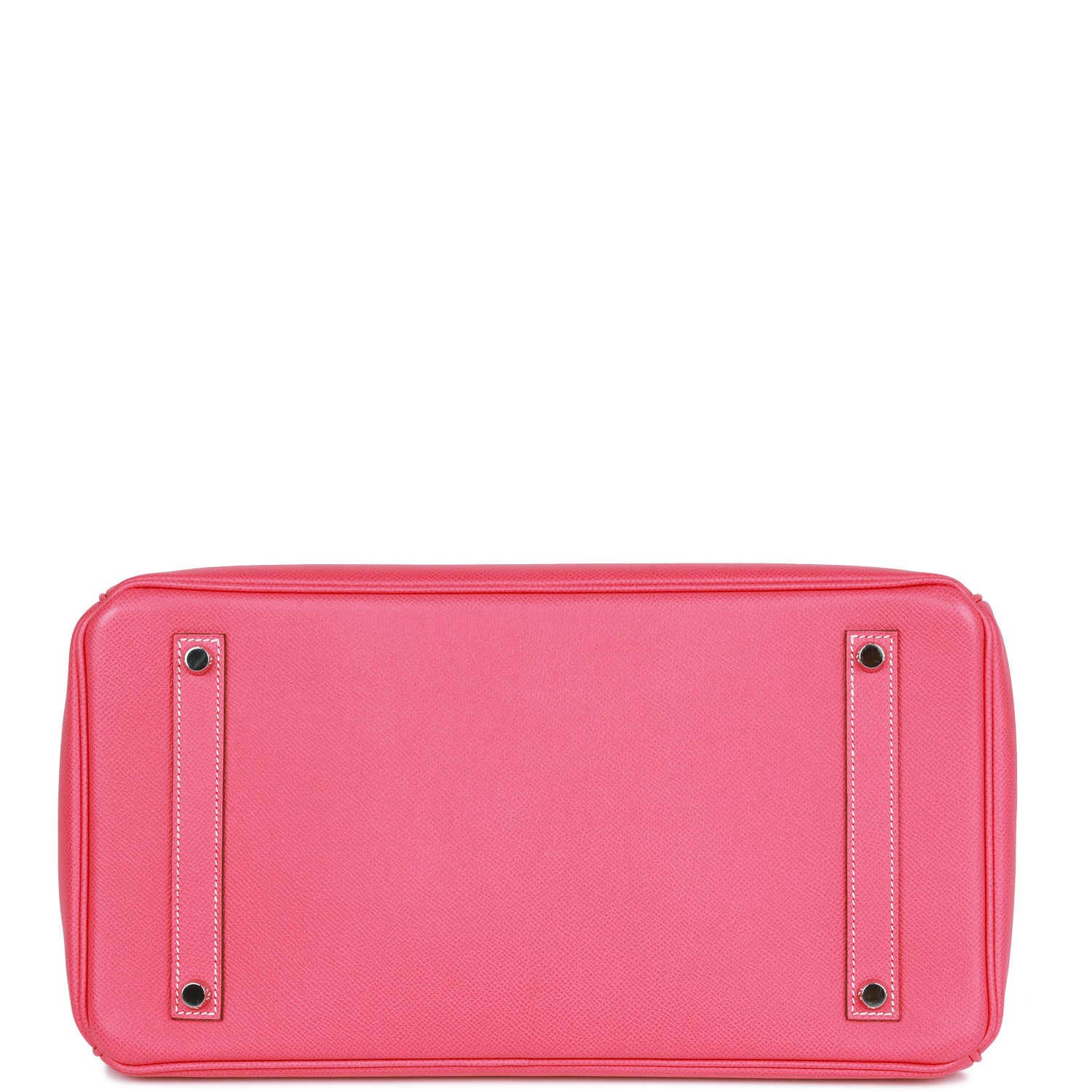 This Birkin is in Rose Tyrien epsom leather with palladium hardware and has contrast stitching, front flap, two straps with center toggle closure, clochette with lock and two keys, and double rolled handles.