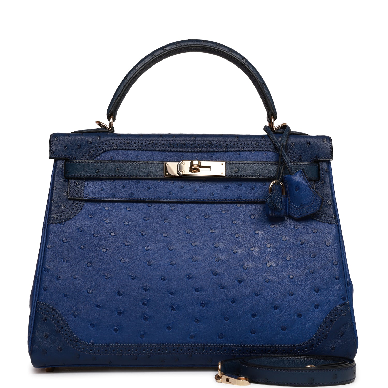 This Ghillies Kelly, in the Retourne style, is in Bleu Saphir, Bleu Iris and Bleu de Malte ostrich with permabrass hardware and has tonal stitching, two straps with front toggle closure, clochette with lock and two keys, single rolled handle and removable shoulder strap.