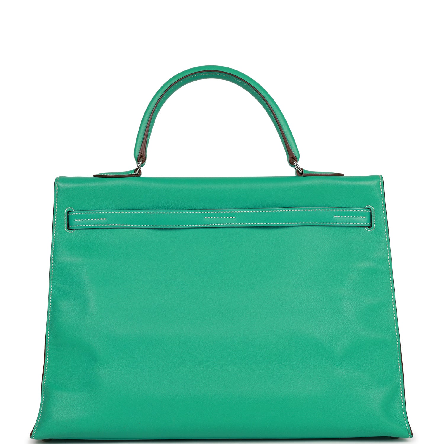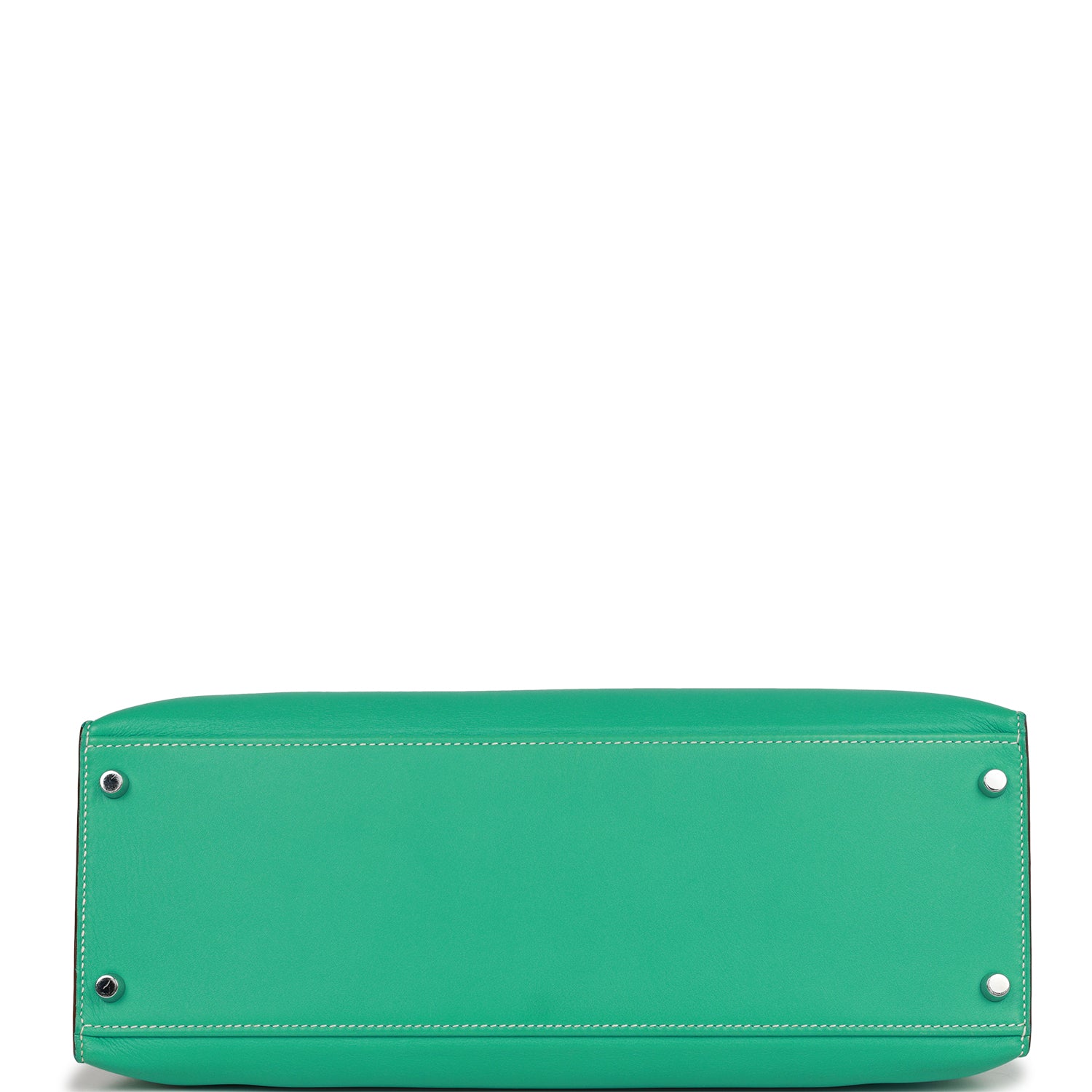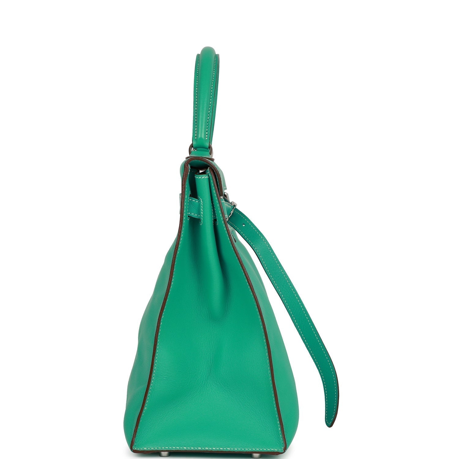 This Kelly, in the Flat style, is in Lagoon swift leather with palladium hardware and has contrast stitching, two straps with front buckle closure, single rolled handle and removable shoulder strap.