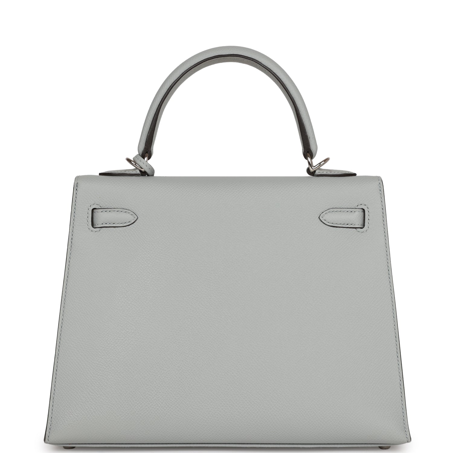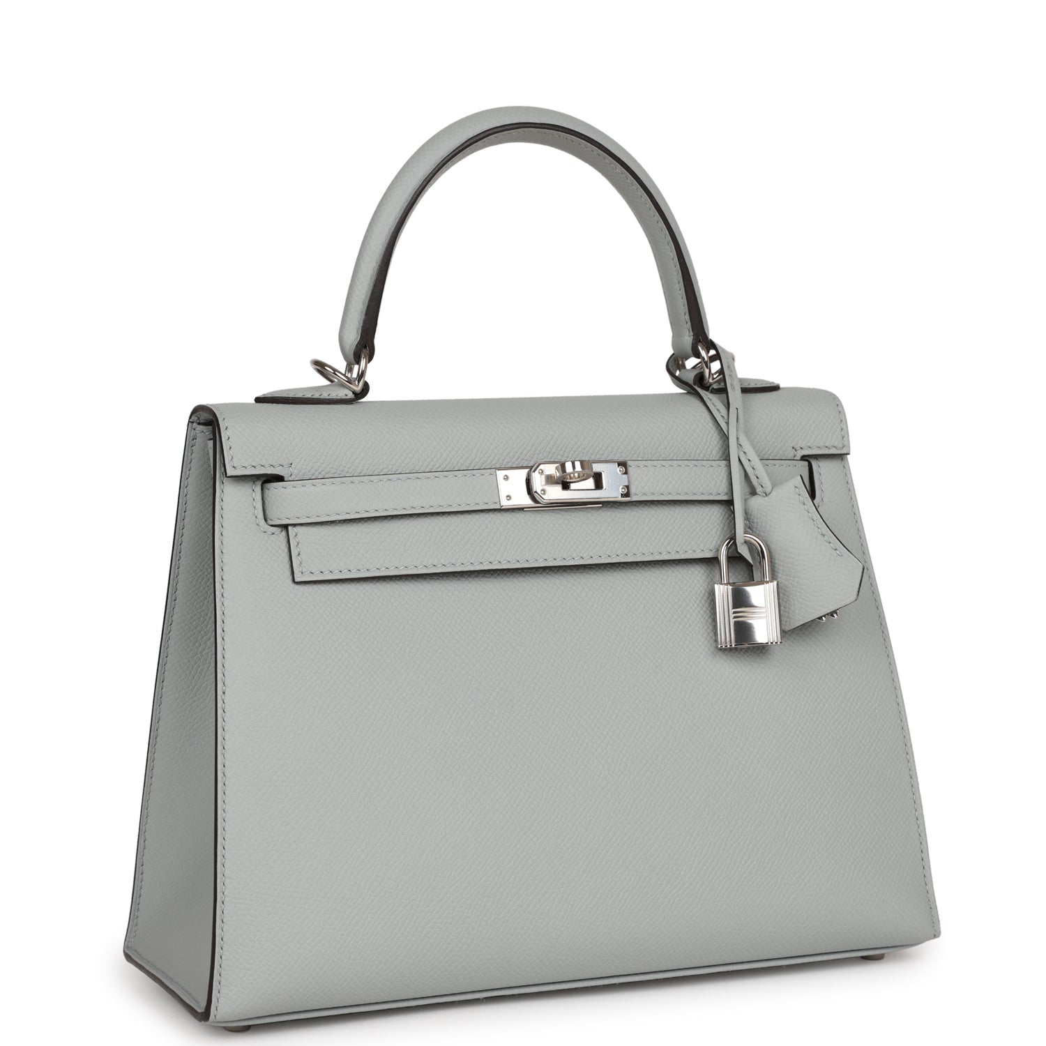 This Kelly, in the Sellier style, is in Bleu Glacier epsom leather with palladium hardware and has tonal stitching, two straps with front toggle closure, clochette with lock and two keys, single rolled handle and removable shoulder strap.