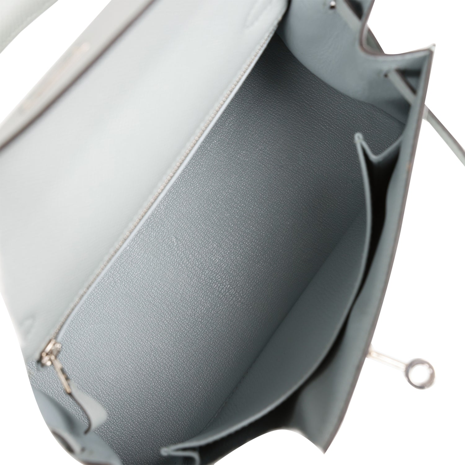 The interior is lined with Bleu Glacier chevre leather and has one zip pocket with an Hermes engraved pull and one open pocket on the opposite side.