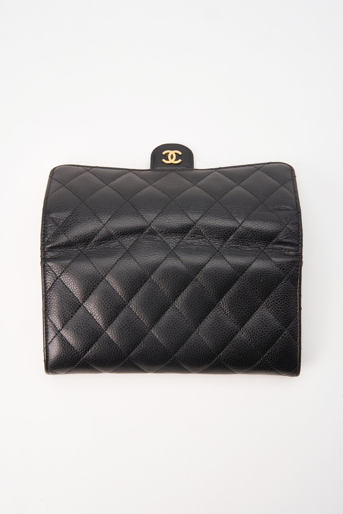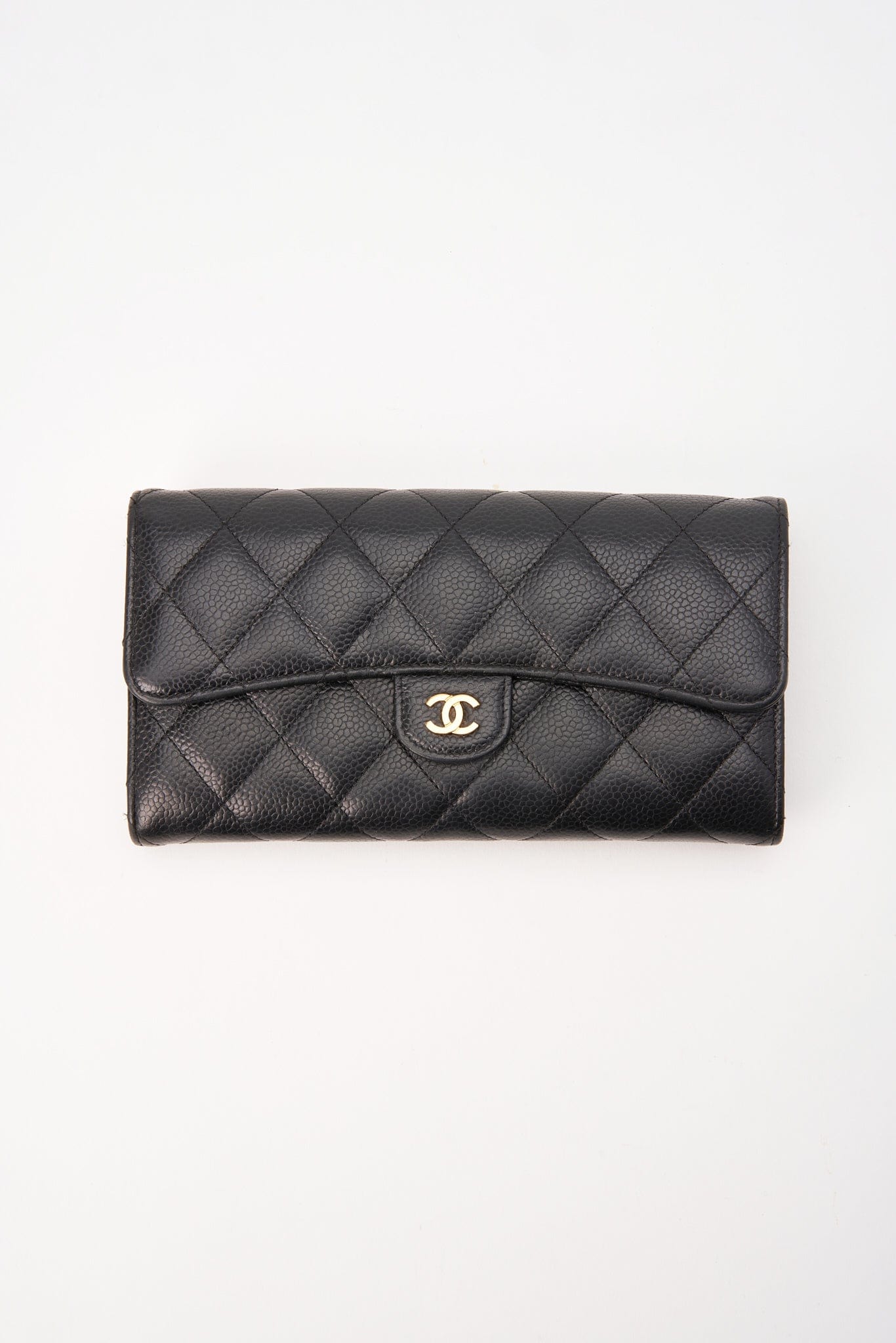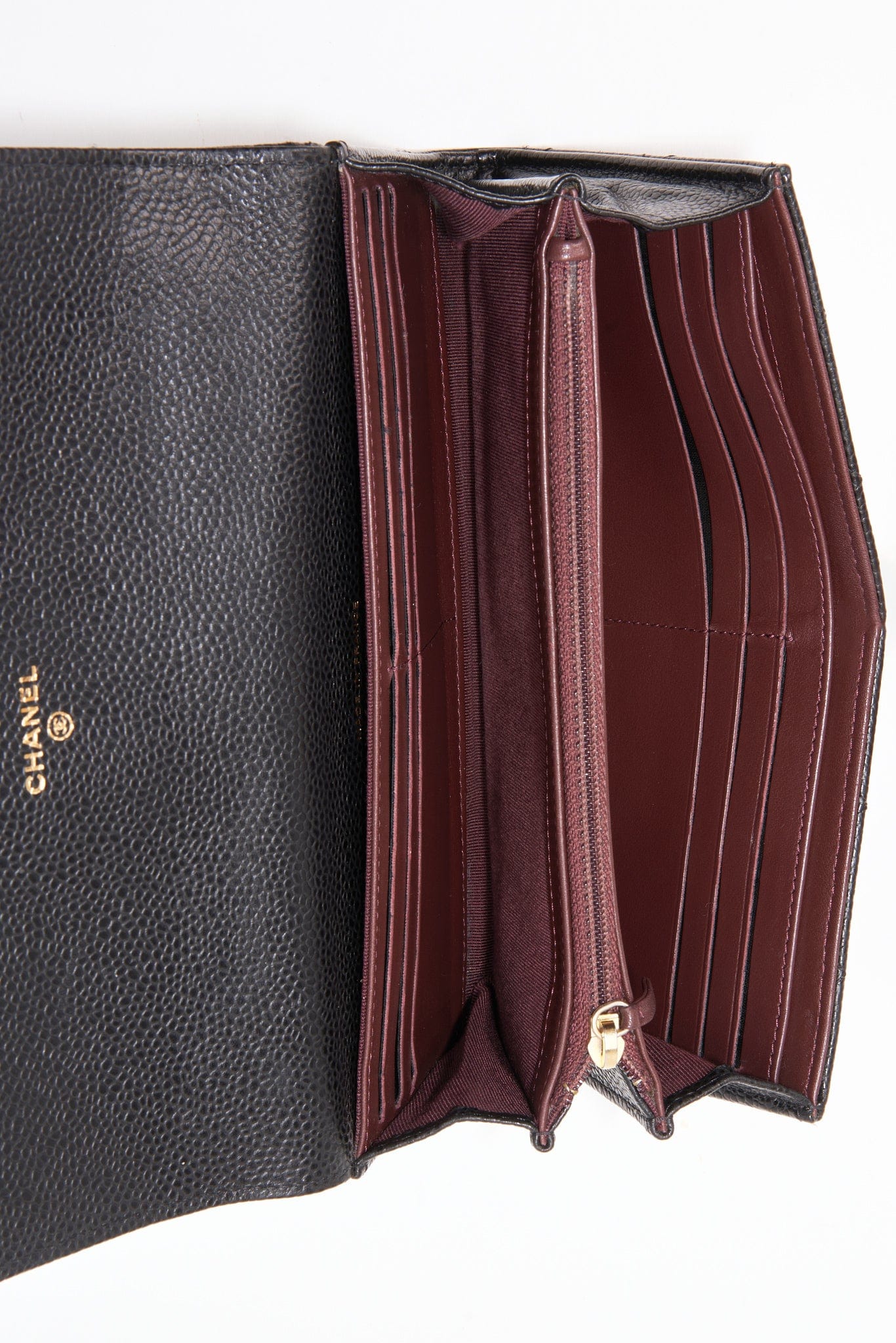 This beautiful Chanel wallet is crafted from black caviar leather with gold hardware. This wallet is lined with a burgundy fabric lining and burgundy leather lining. There are slip pockets plus a zipped pocket for your valuables.