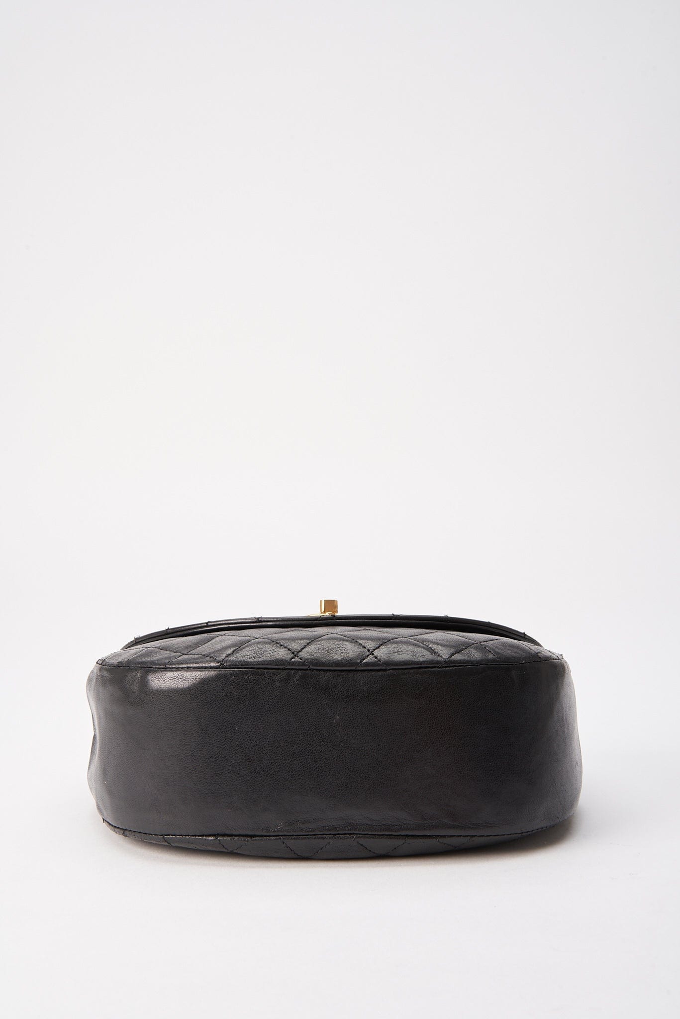 This vintage Classic Chanel Single Flap bag is crafted from black diamond quilted lambskin leather with 24k gold-plated hardware and a single leather-trimmed chain-link shoulder strap. There is slip pocket inside this bag plus the interior is lined with maroon leather.