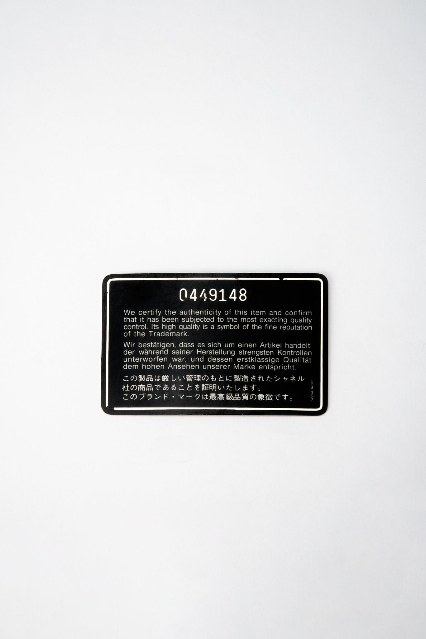 The serial number on the sticker tells us the bag was made between 1986 and 1988. This bag is in very good vintage condition with some minor signs of use. The hallmark on the CC turn lock confirms the gold hardware is plated in 24K gold, a real collectors item. Before 2008, Chanel Classic Flaps with gold coloured hardware (chains, clasps, grommets, and CC turn locks) were all plated in real 24K gold.