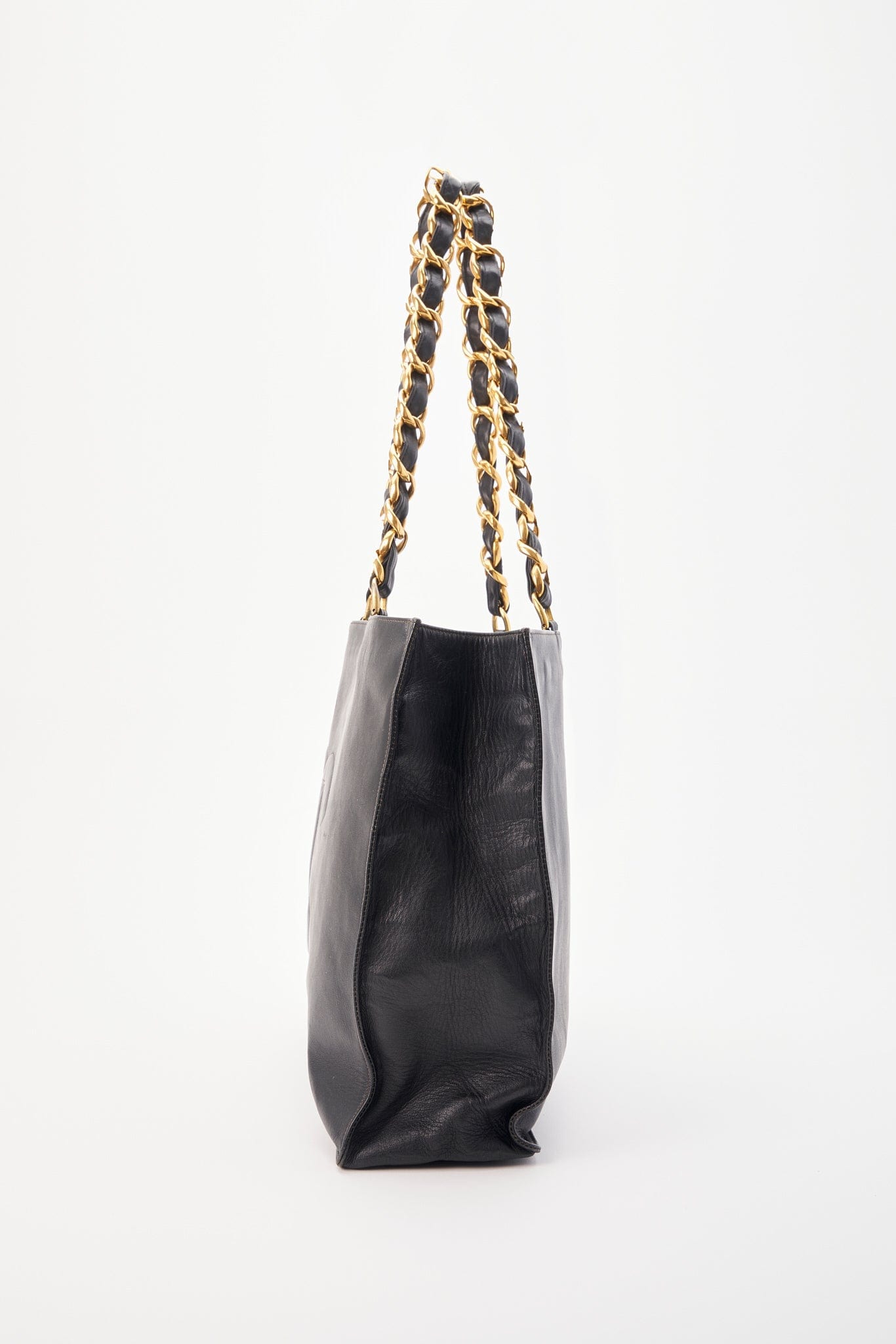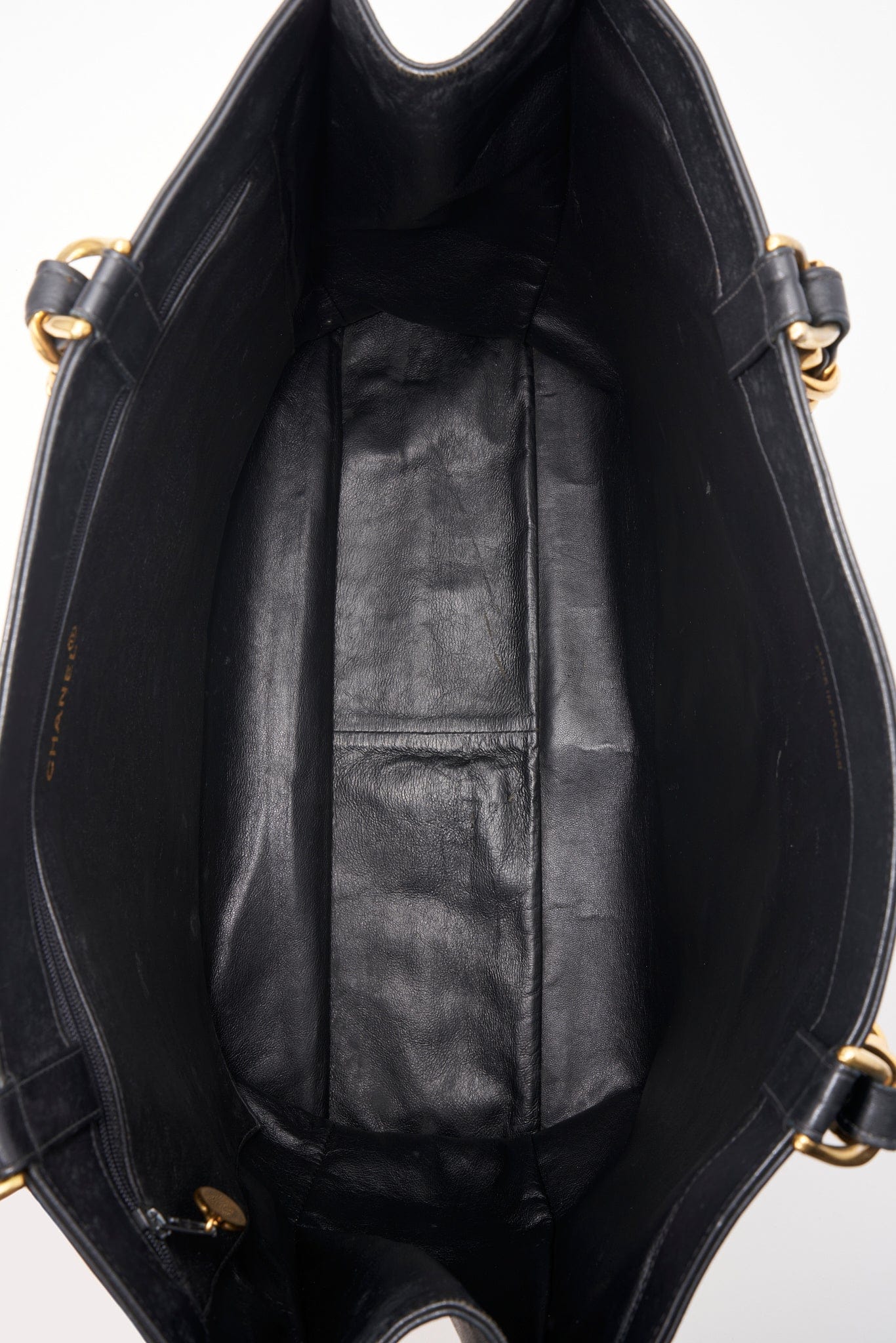 A vintage Chanel black leather tote bag which features chinky double chain shoulder straps.