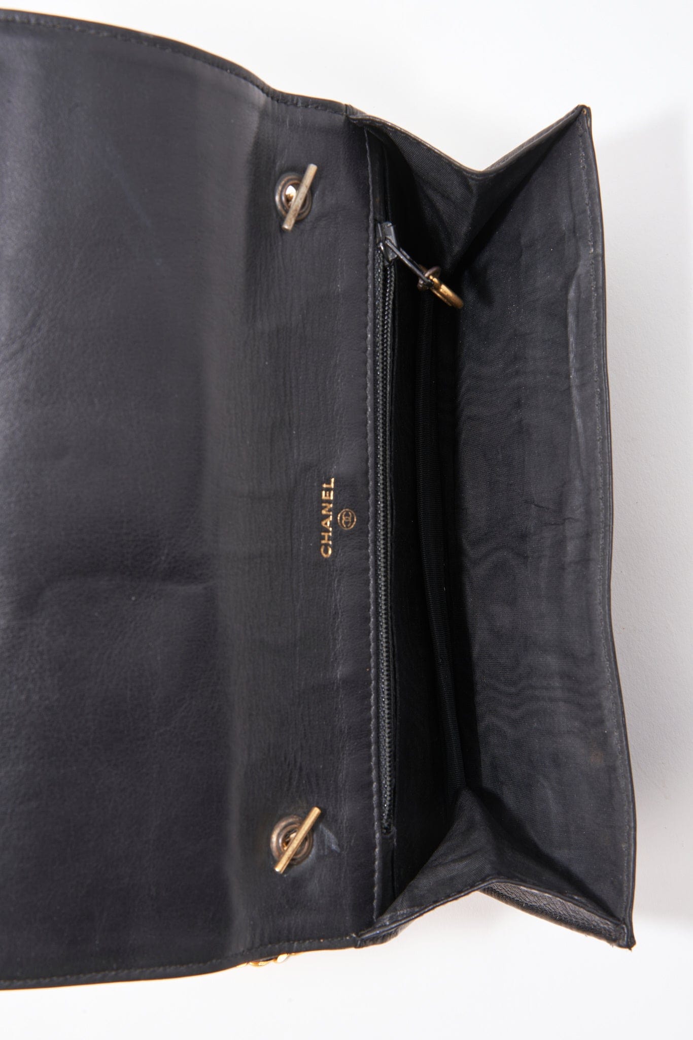 This Chanel wallet on chain, WOC, is crafted with black smooth lambskin leather with gold hardware and a single leather-trimmed chain-link shoulder strap.