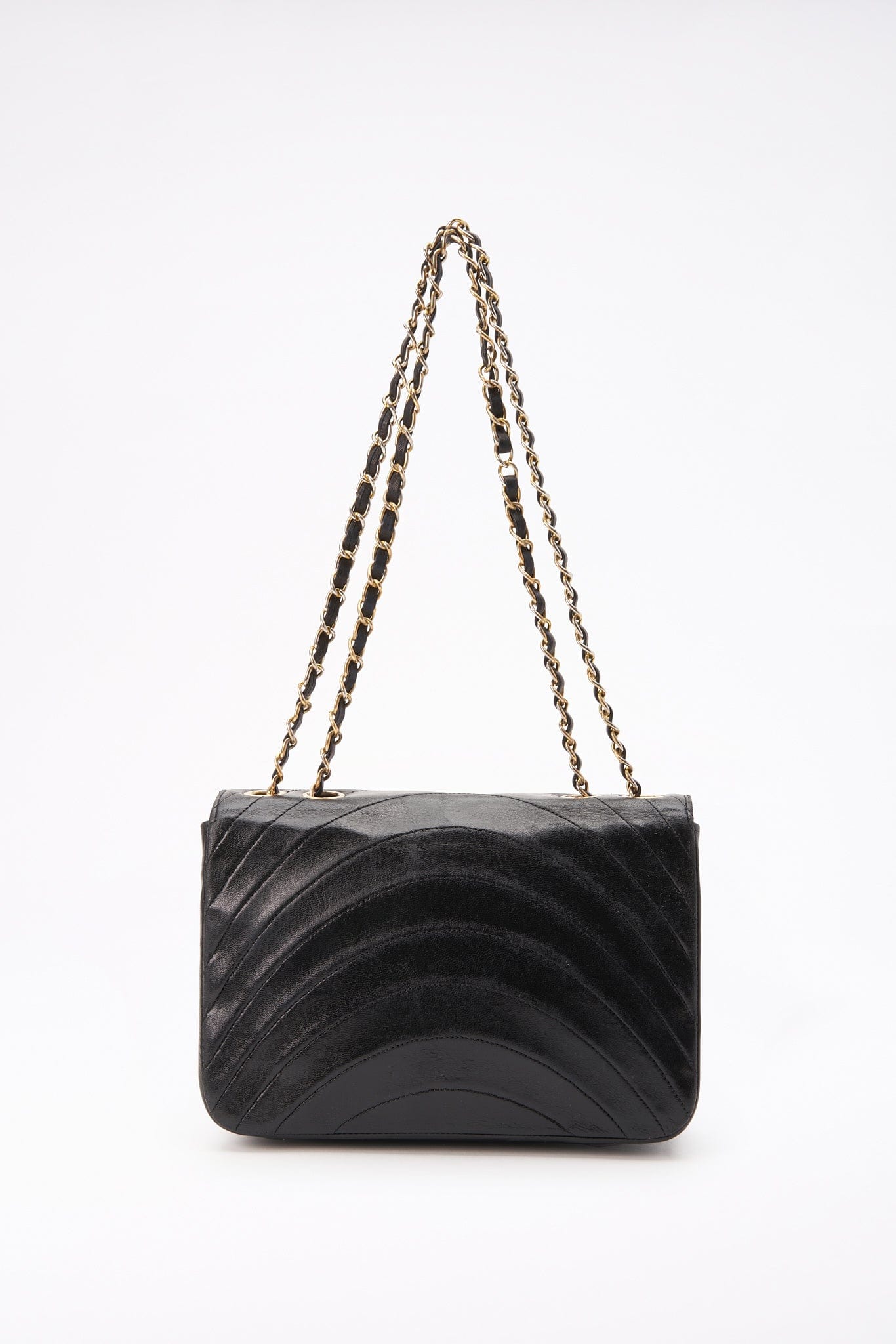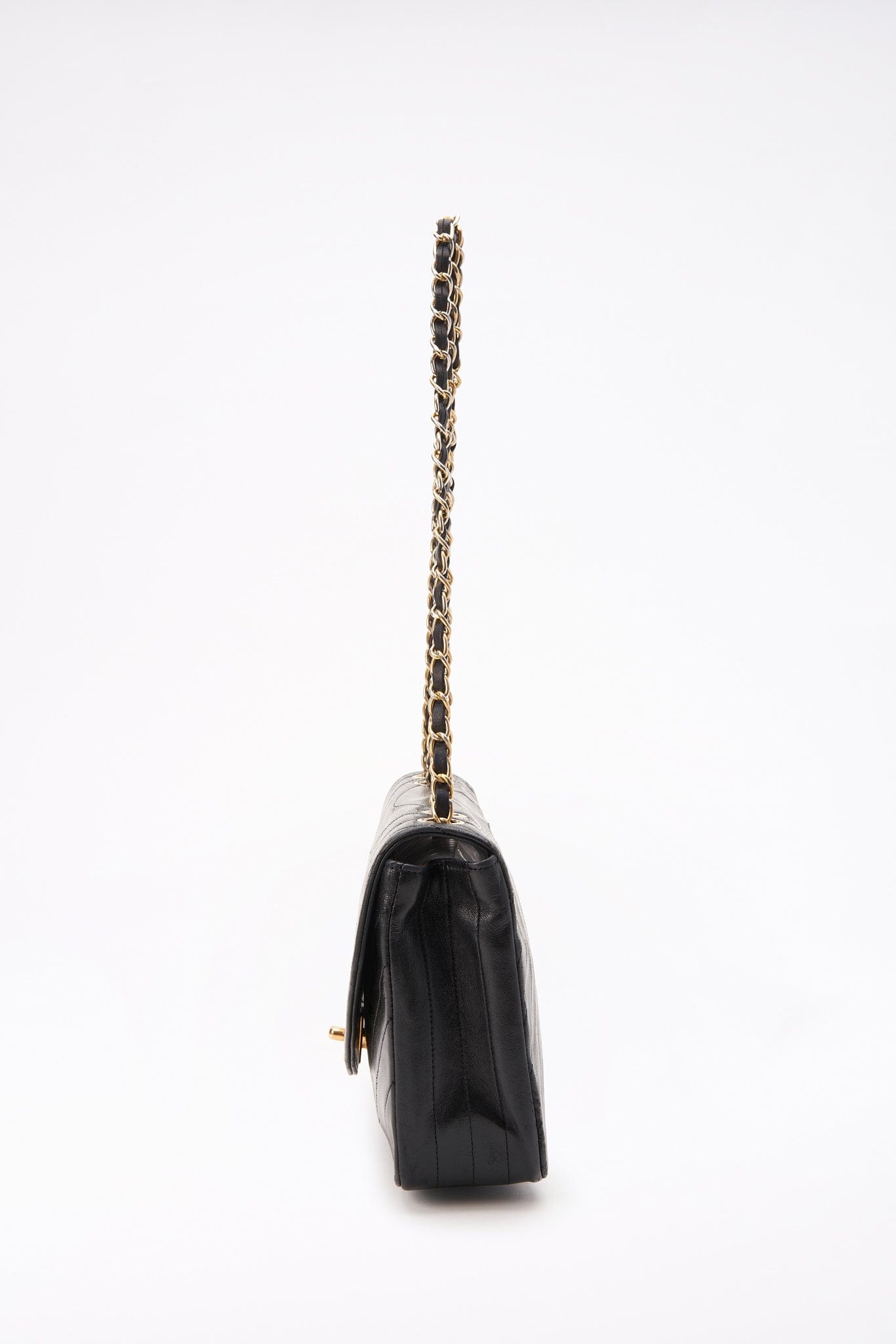 This vintage Classic Chanel Single Flap bag is crafted from black quilted lambskin leather with 24k gold-plated hardware and a leather-trimmed chain shoulder strap. There is a zip and a slip pocket inside this bag plus the interior is lined with maroon leather.