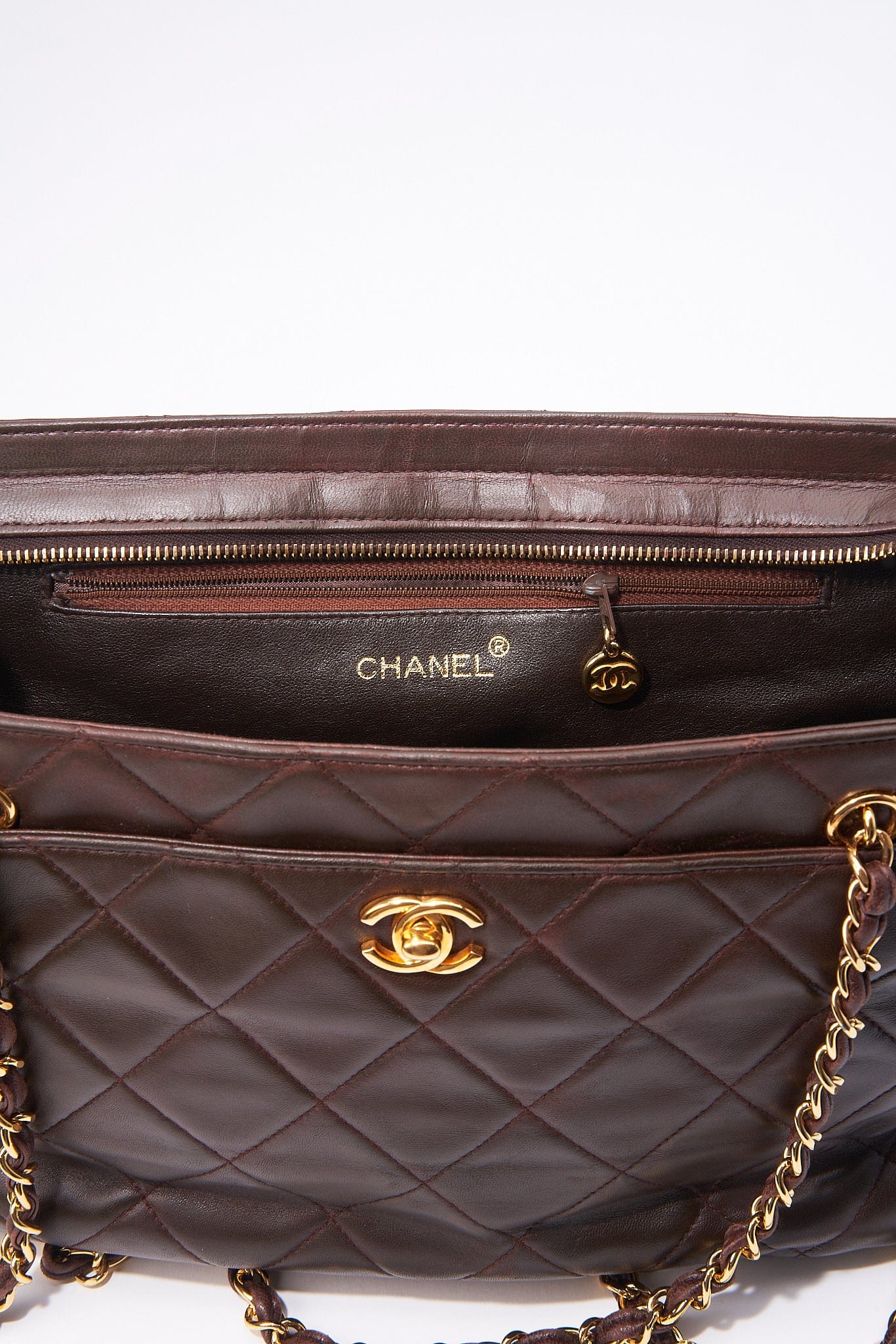 This bag is closed via a zip and features a Chanel branded tab.