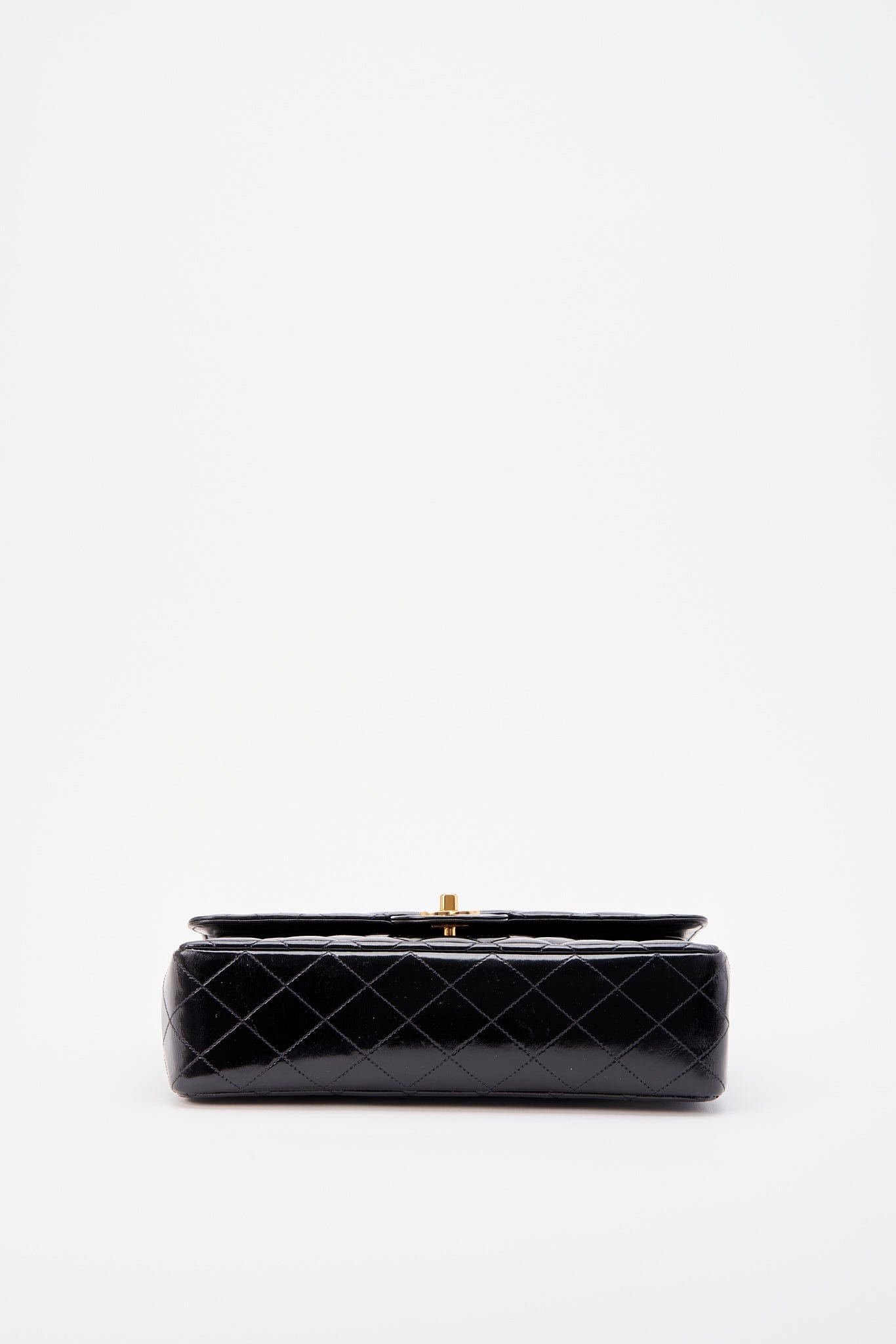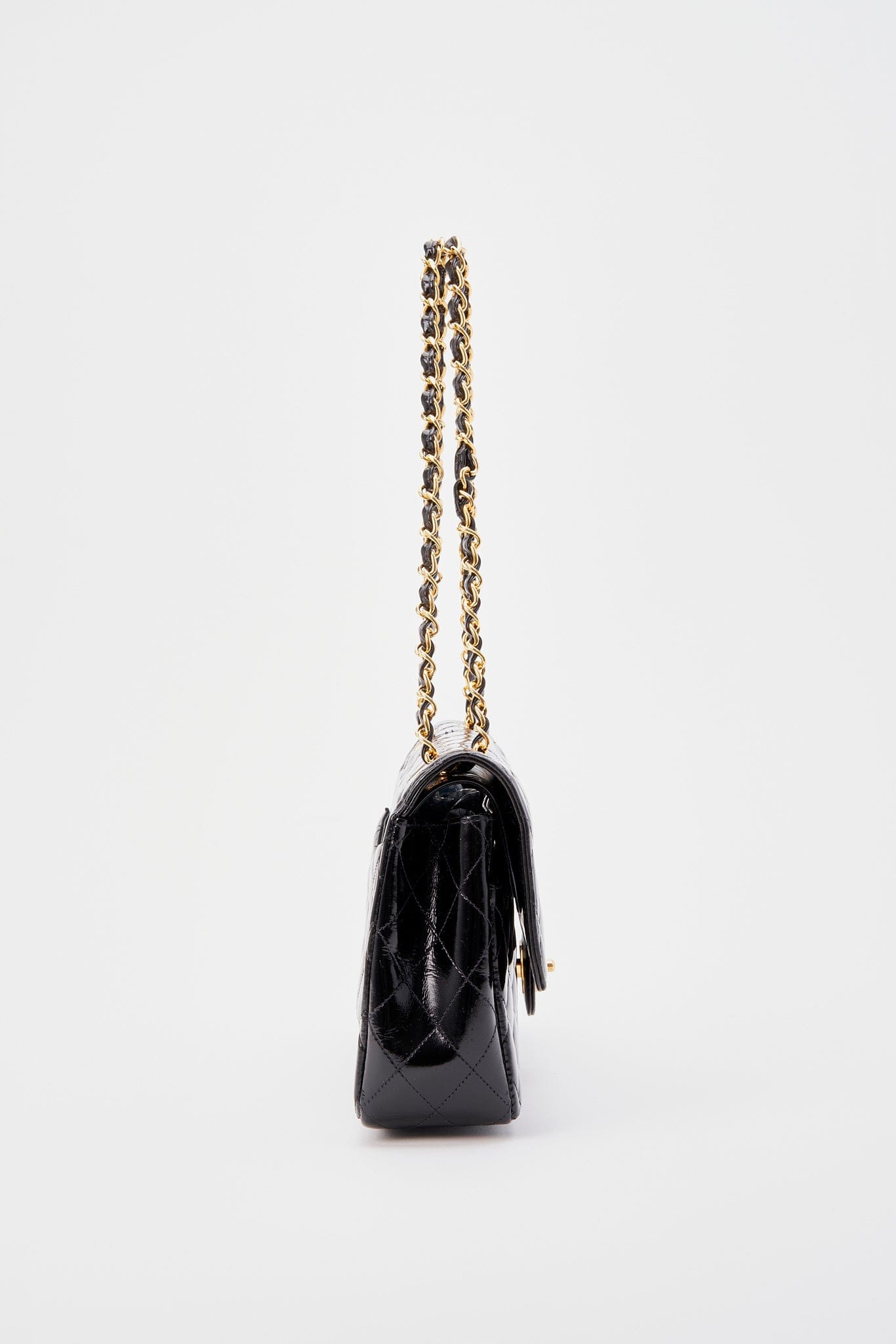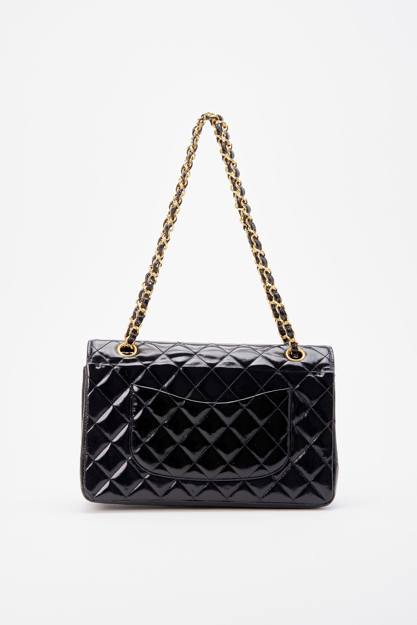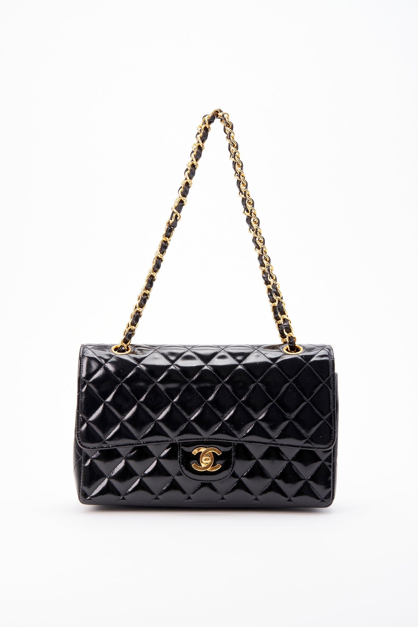 This vintage Classic Chanel Medium Double Flap bag is crafted from black diamond quilted patent leather with 24k gold-plated hardware and a single convertible leather-trimmed chain-link shoulder strap. There is a single exterior patch pocket on the back, a single zip pocket under the front flap and three interior compartments. Inside the bag is lined with a black leather.