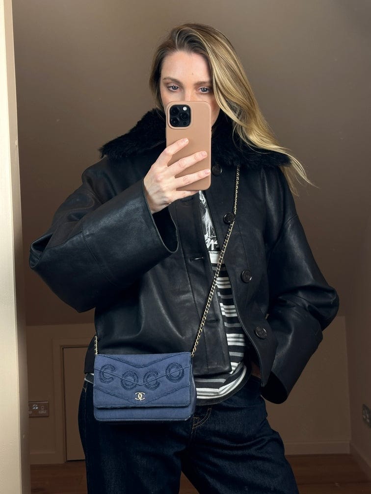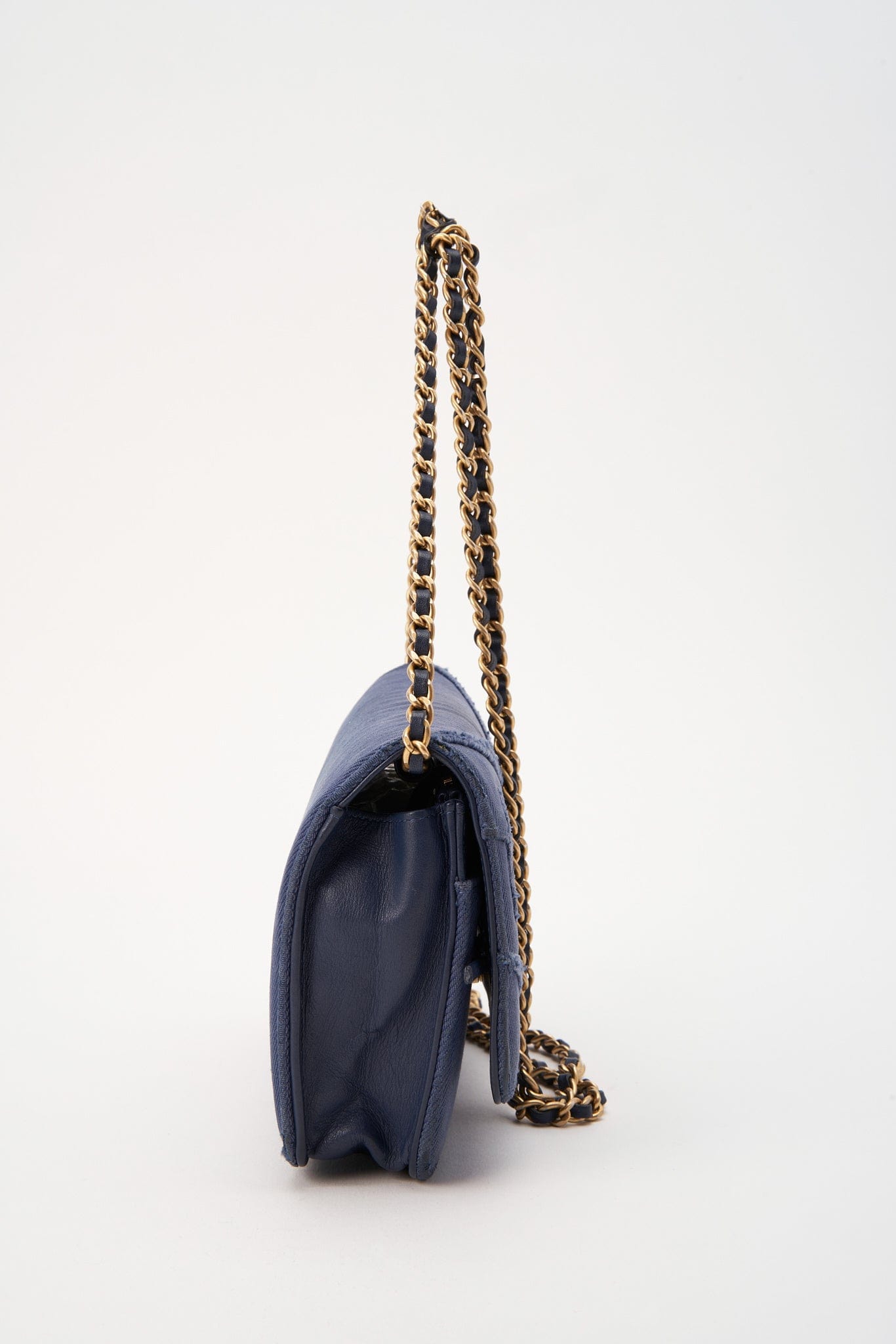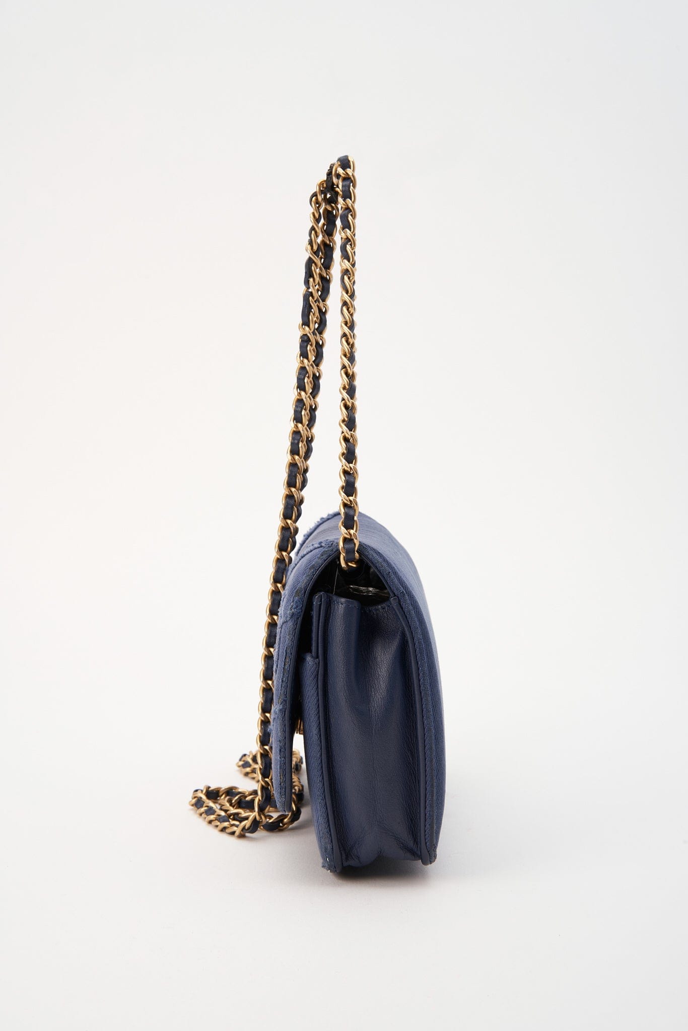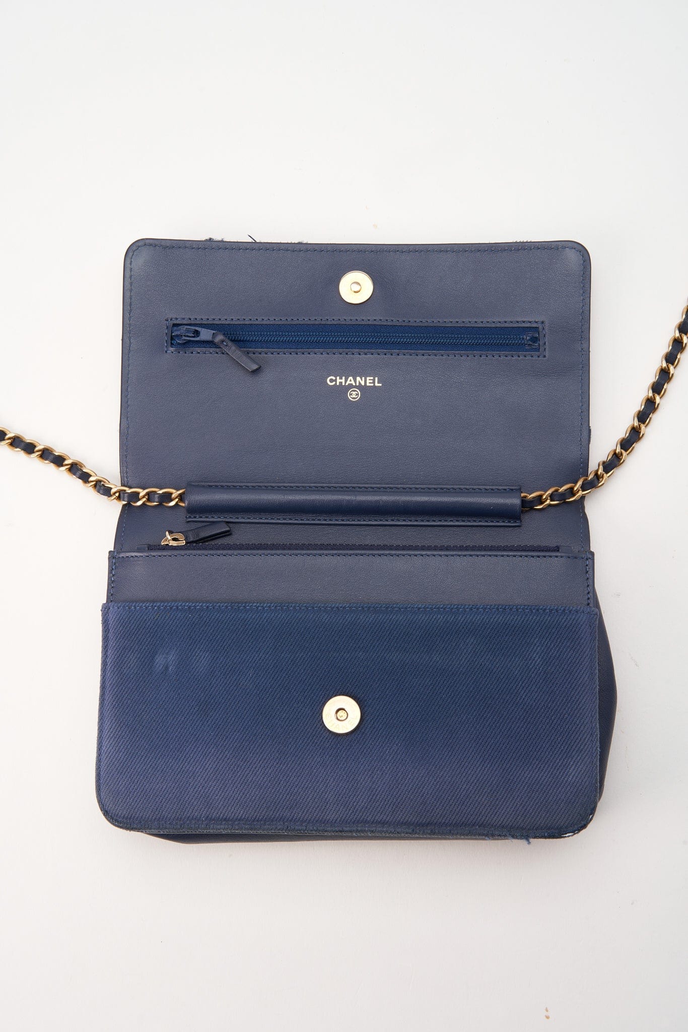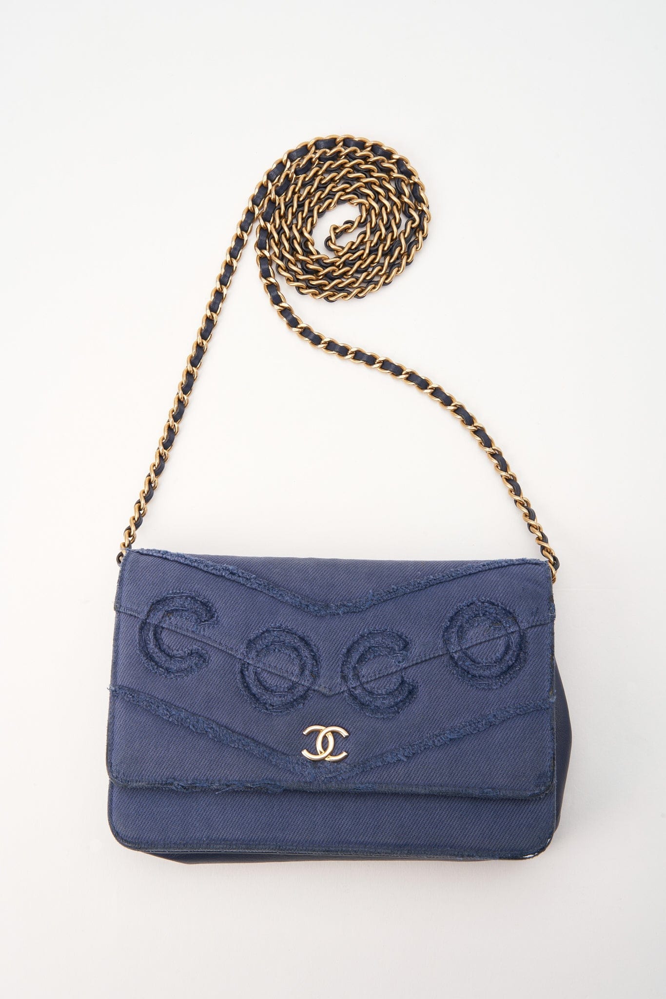 This Chanel wallet on chain, WOC, is crafted from a denim fabric and is lined with a blue lambskin leather, gold hardware and a single leather-trimmed chain-link shoulder strap.