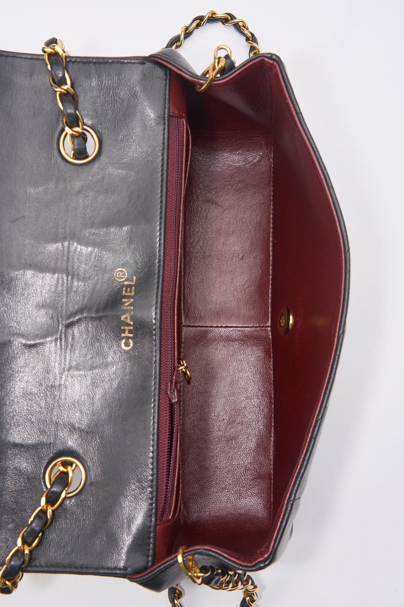 This vintage Chanel Diana Single Flap bag is crafted with black diamond quilted lambskin leather with 24k gold-plated hardware and a single leather-trimmed chain-link shoulder strap. There is a zip and a slip pocket inside this bag plus the interior is lined with maroon leather.
