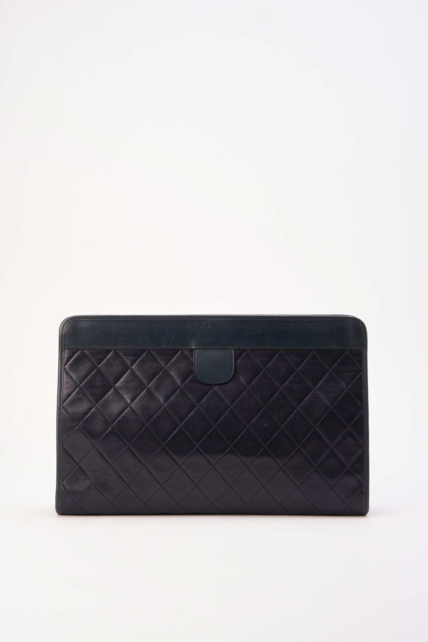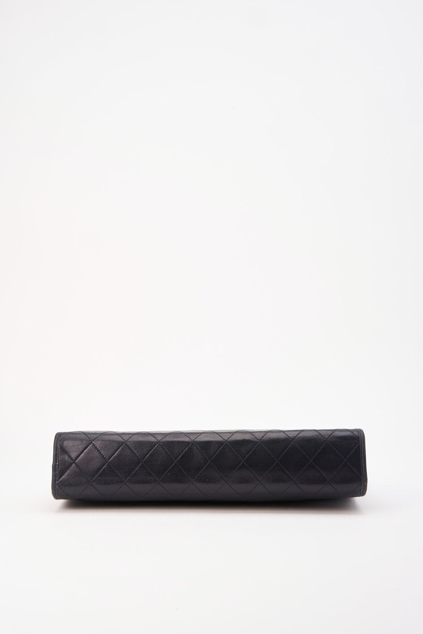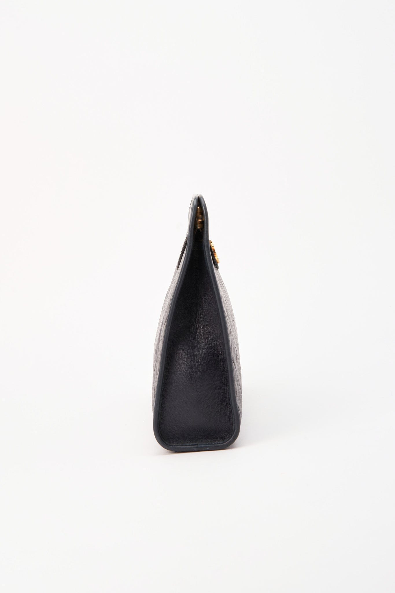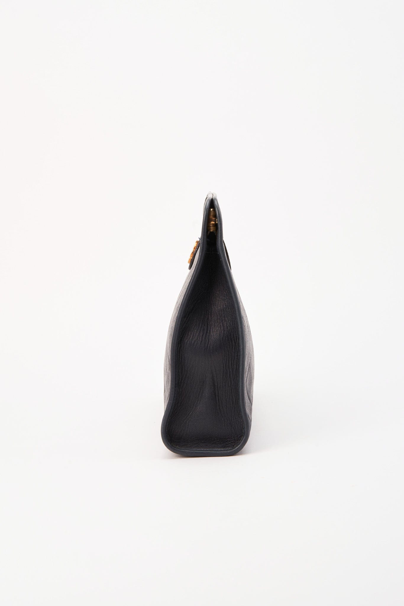 This beautiful vintage Chanel clutch bag is crafted from a very dark navy/almost black leather with 24K gold plated hardware. it has a metal insert into the top edge to enable to open and snap shut securely.