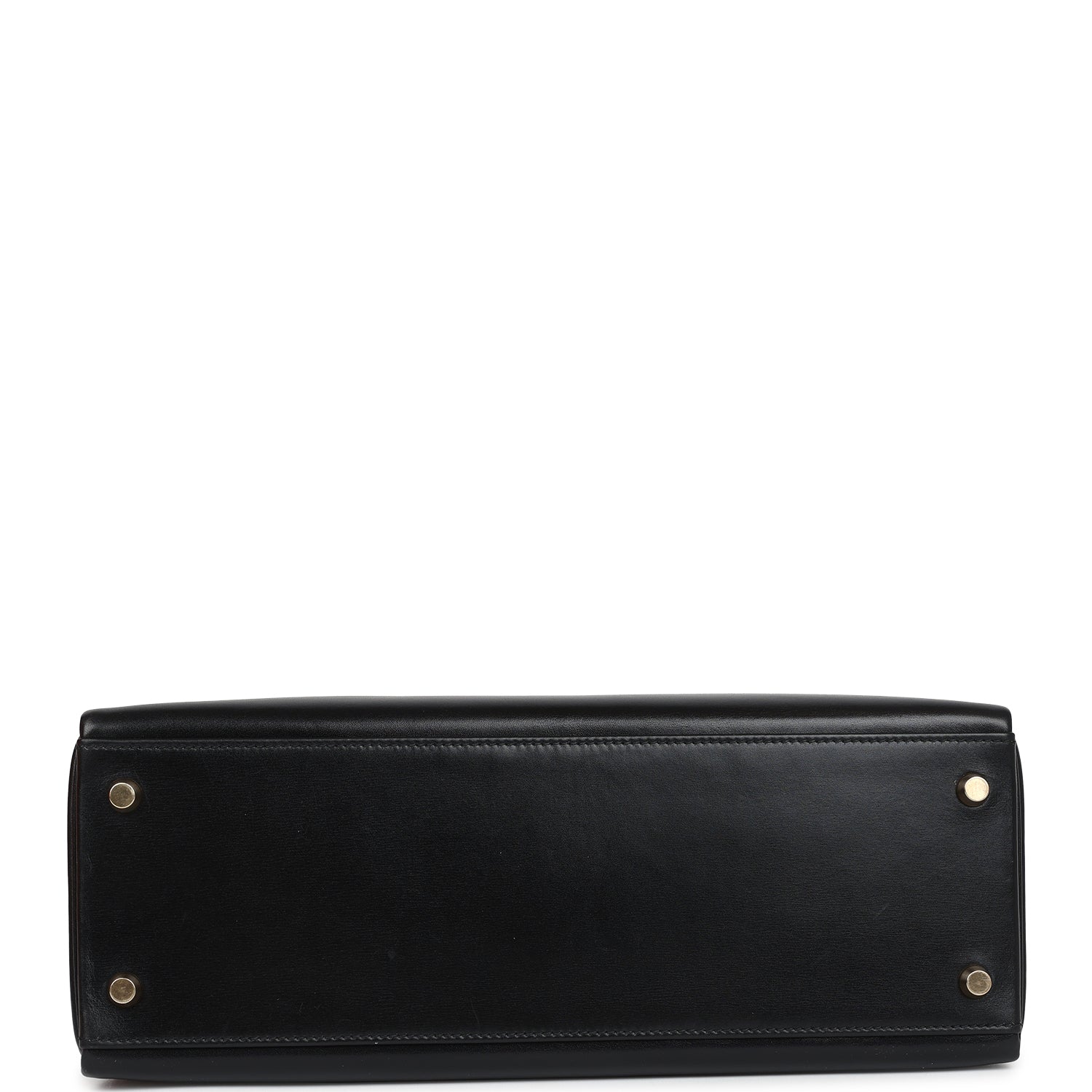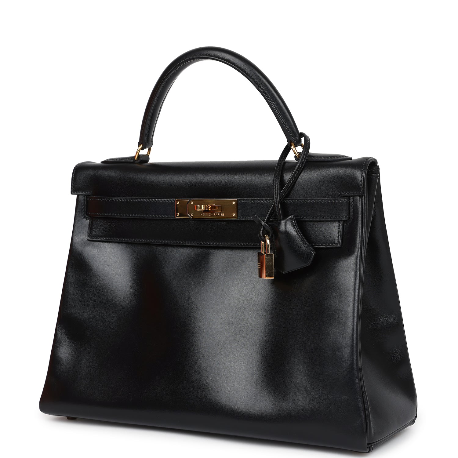 This vintage Kelly, in the Retourne style, is in Black box calfskin leather with gold hardware and has tonal stitching, two front straps with front toggle closure, single rolled handle and removable shoulder strap.