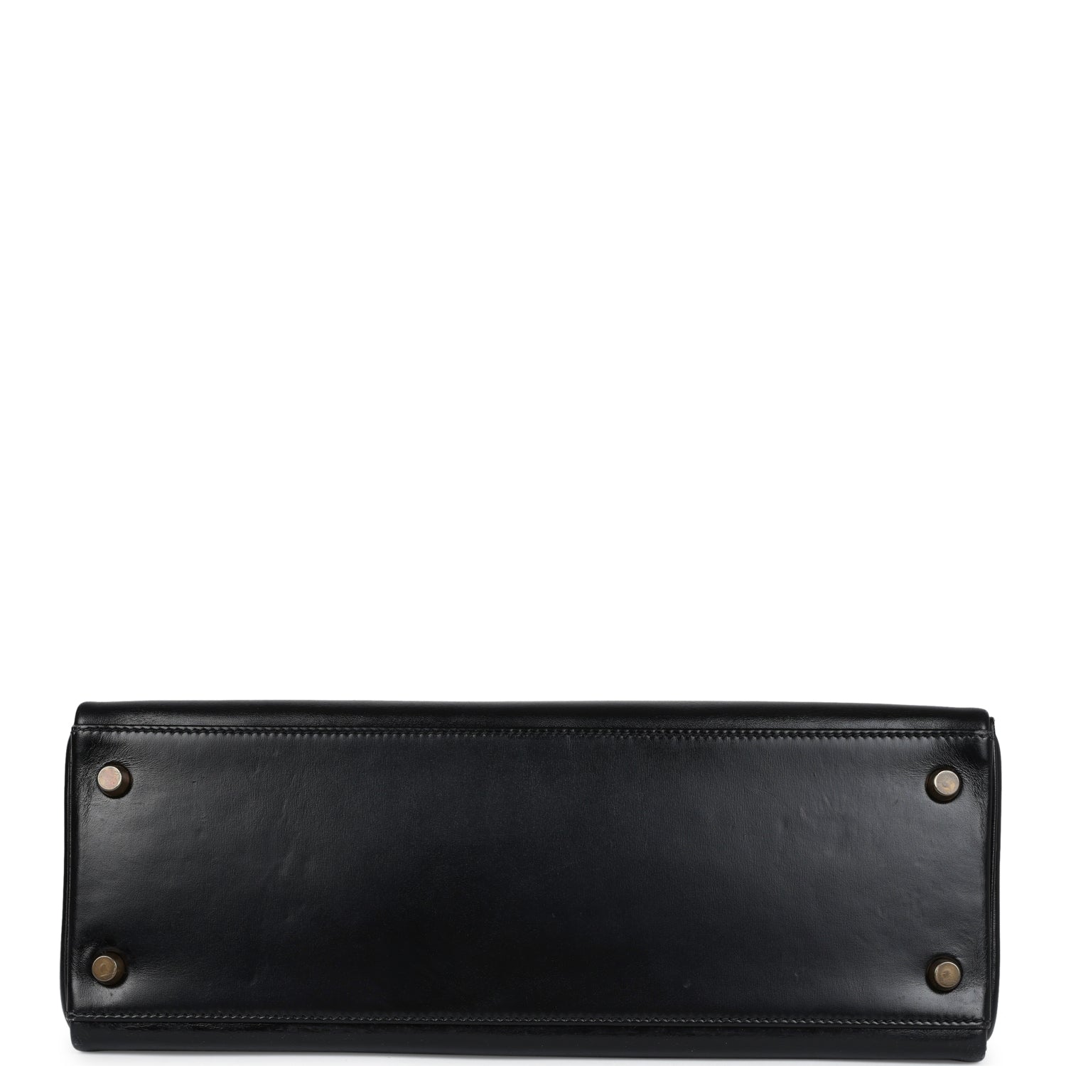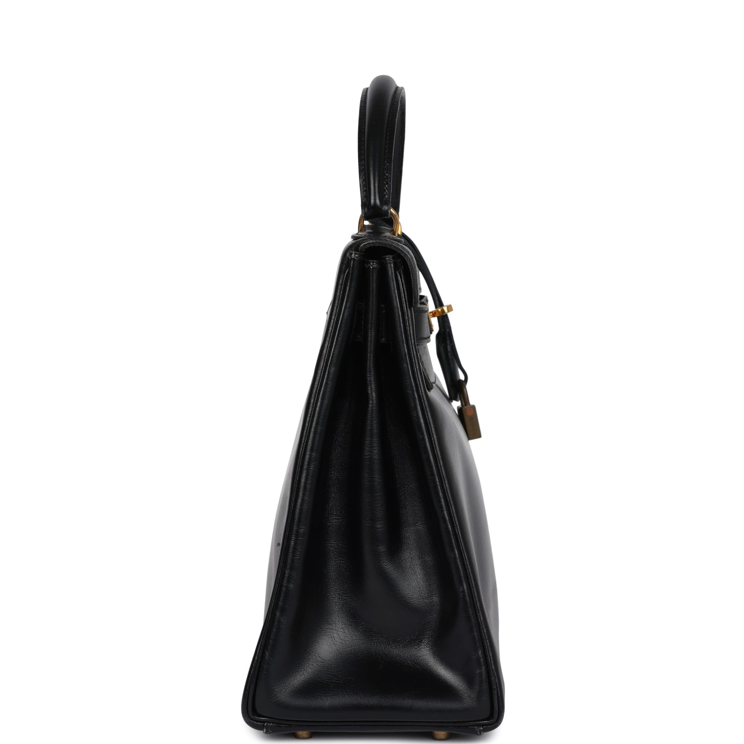 This vintage Kelly, in the Retourne style, is in Black box calfskin leather with gold hardware and has tonal stitching, two front straps with front toggle closure, single rolled handle and removable shoulder strap.