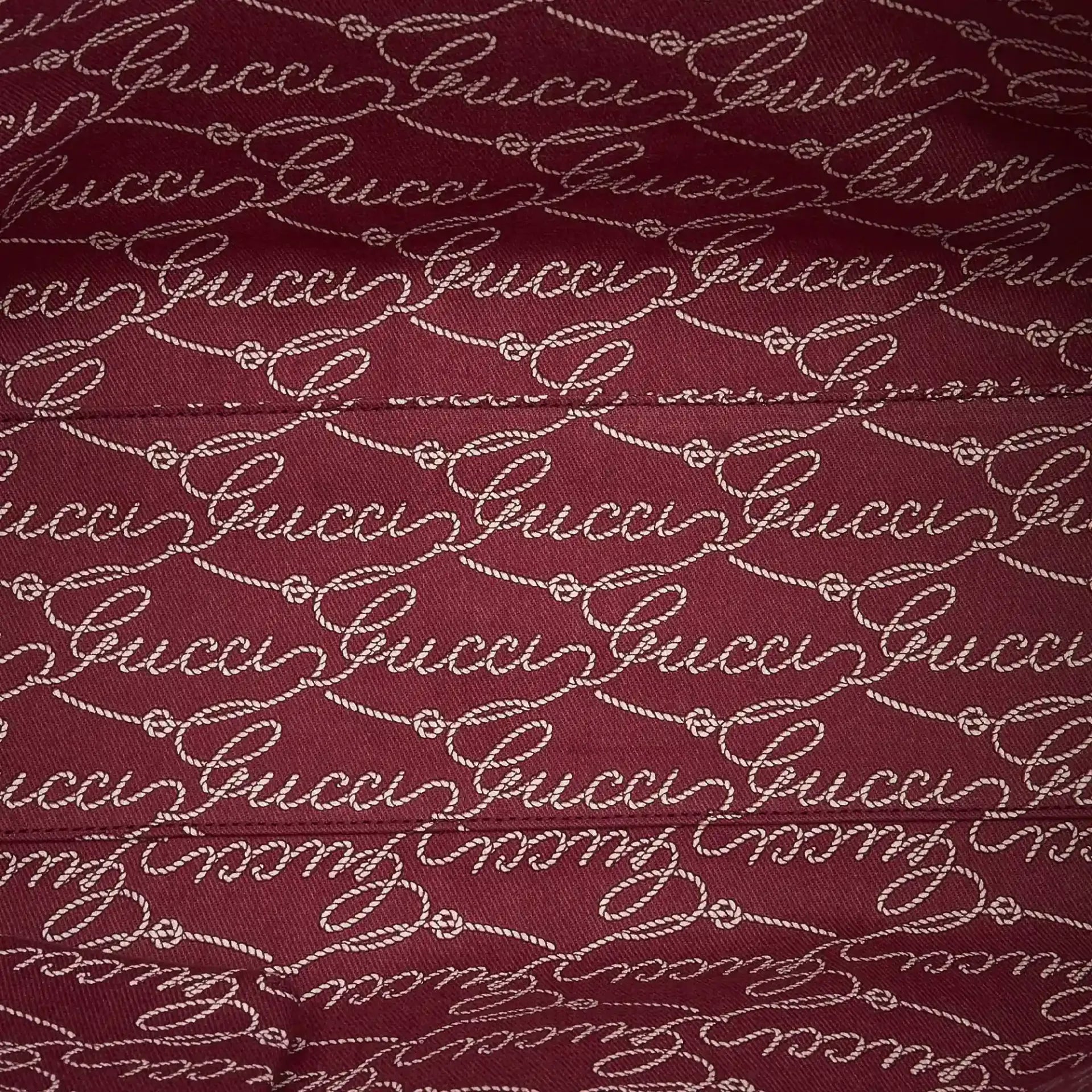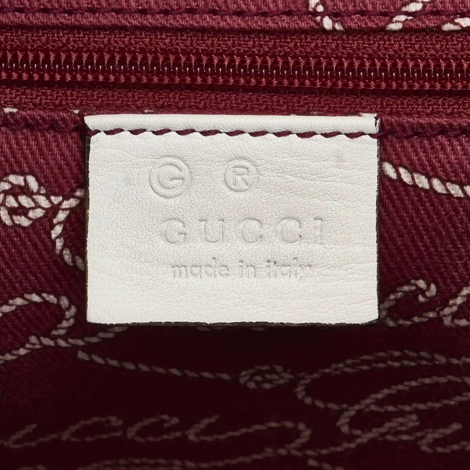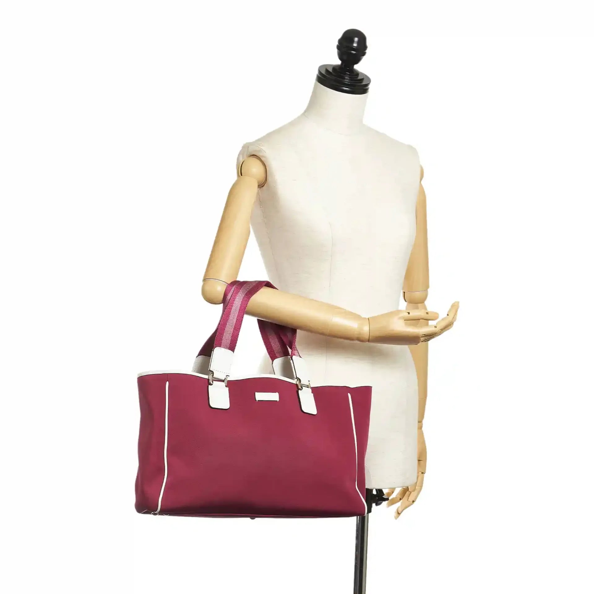 This Gucci Tote BAG was made from canvas in a dark pink and has caps and details made of white leather. On the back it has Bag An outer piece of plug. At its upper opening the Bag Magnetically closed. In the interior, the Bag A zipper compartment. the Bag has flat handle made of striped woven band that allow it to Bag to guide in the hand and in the arm.